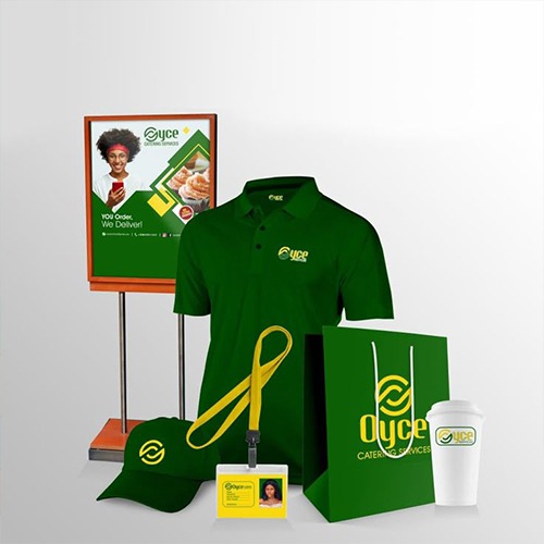 Roll-up and walk banners, posters, business cards, ID cards, letterheads, envelopes, notebooks, mugs, T-shirts, caps, bags and custom packaging to promote your brand.